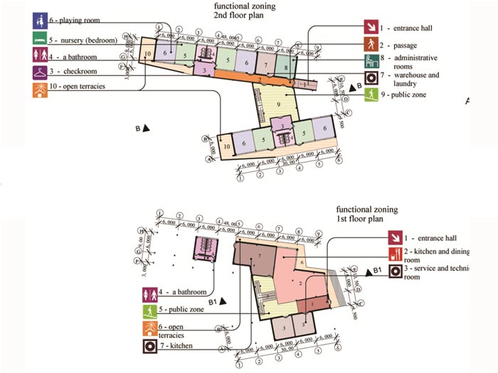 The main entrance is located on the ground level and looks east. From the small lobby it is easy to get into the dining room. Next to it there is the kitchen with a distributing point and a washer. Walking up the stairs we will get to a large bright hall where joint classes for the guys in sports, music, dancing are to take place. From the hall you can get into children’s rooms, passing the dressing rooms and adjoining common bathrooms and toilets. Before the rooms there is a terrace which protects them from wind. Also on the second level there are the store, the laundry and the staff room.