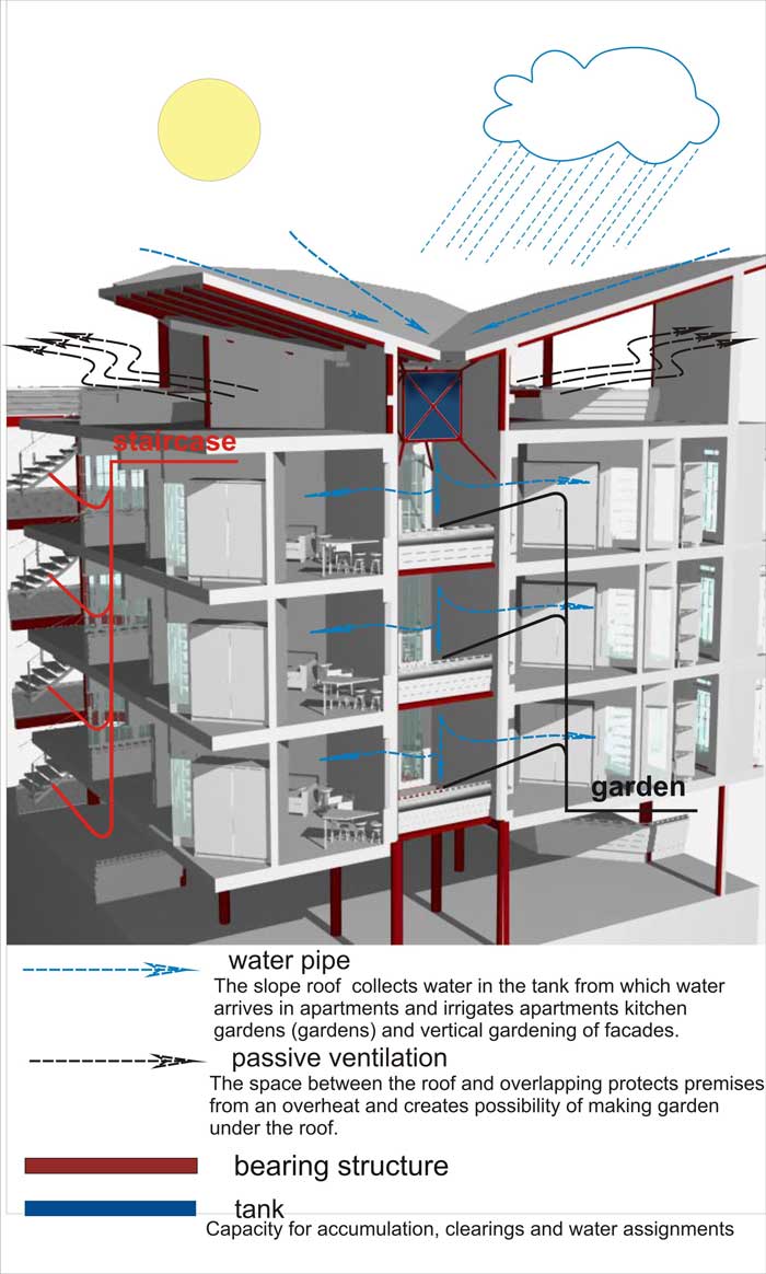 Экологичность нашему проекту придает большое количество территорий, выделенных под gardening: балконы, приспособленные под выращивание растений непосредственно в ограждении, открытые веранды на верхних этажах под кровлей, лестничные площадки, террасы, которые так же защищают от сезонного зноя. Обтекание здания снизу воздухом позволяет избежать образования ветровой тени, обеспечивает защиту от грунтовой влаги, насекомых и грызунов.