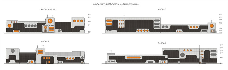 Фасады университета и общежития имеют плавные линии, скруглённые углы, огромные окна, похожие на иллюминаторы фантастического космического звездолёта.