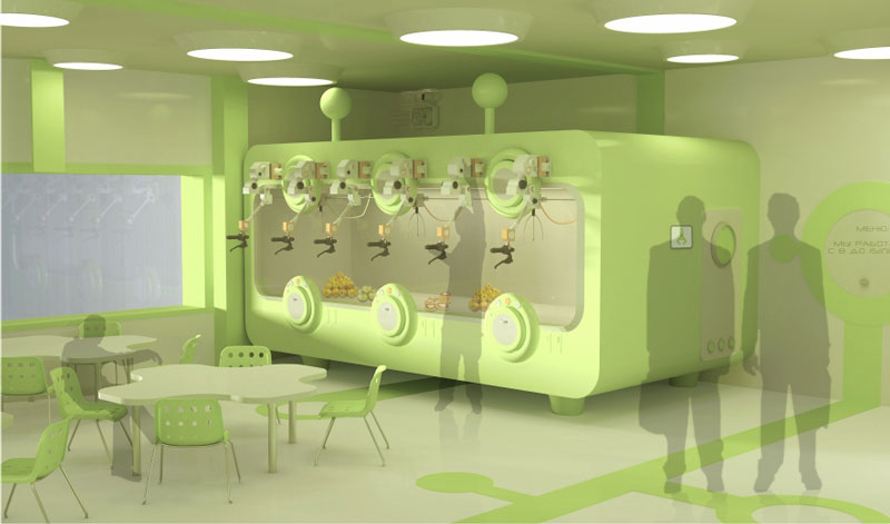 Аналогом для создания этого устройства послужил стандартный автомат с мягкими игрушками, где с помощью рычага можно было управлять хватательным щупом и доставать приз. Заменив рычаг манипуляторами из лаборатории, обучение взаимодействию со сложной техникой превратилось в игру, а поощрительным призом является пирожки или другая еда.