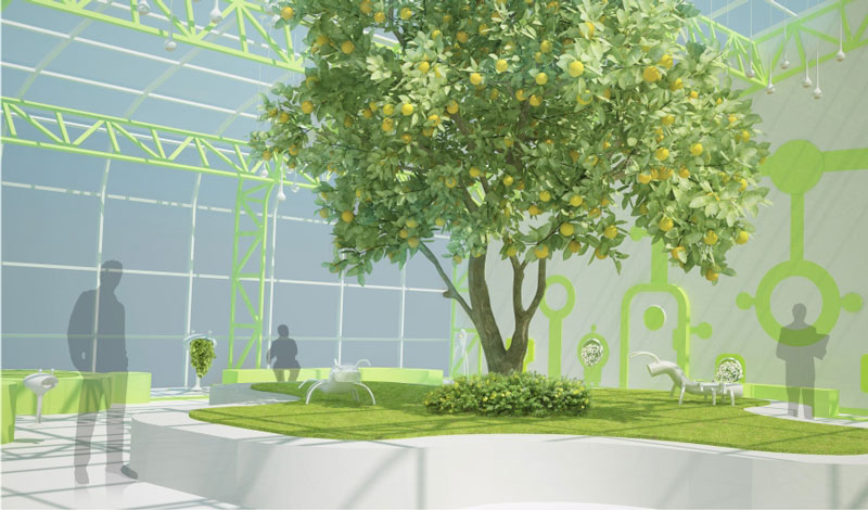 Концепция связана с темой футуристического, научного будущего, высоких разработок и физикой. За основу художественного образа был взят космический дизайн, где умные машины помогают человеку добиться небывалых высот в науке и жизни. Так, например, дорожки и площадки с цветниками на плане похожи на созвездия или взлётные площадки, а оборудование и средовые объекты – на звездолёты и фантастические космические станции.