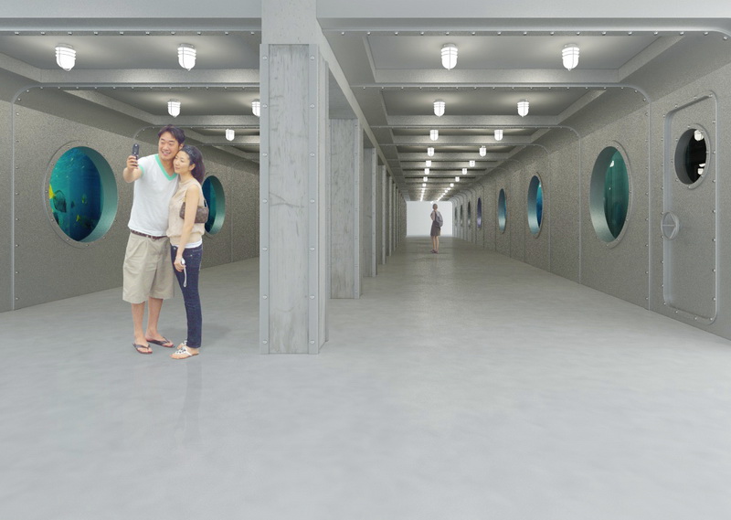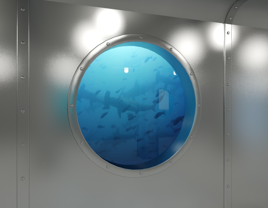 Для того чтобы человек ощутил реальность нахождения в батискафе под водой, стены были сдвинуты, а за иллюминаторами были поставлены изображения с морским миром и организована подсветка над каждым изображением, чтобы создать эффект, когда лучи света проходят сквозь морскую воду. Благодаря тому, что картинки не вплотную прилегают к иллюминаторам, они создают глубину изображения, и человек, как бы, реально присутствует в батискафе и наблюдает за морским миром.
