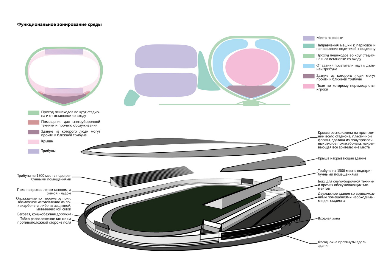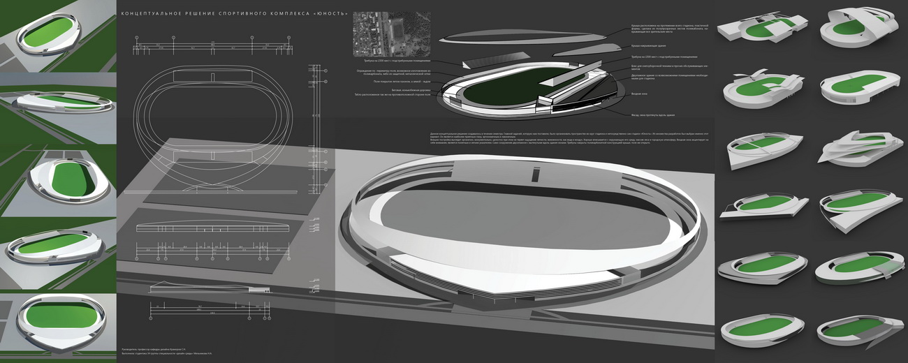 Данное концептуальное решение создавалось в течении семестра. Главной задачей, которую нам поставили, было организовать пространство вокруг стадиона и непосредственно сам стадион «Юность». Из множества разработок был выбран именно этот вариант. Он является наиболее приятным глазу, эргономичным и лаконичным.