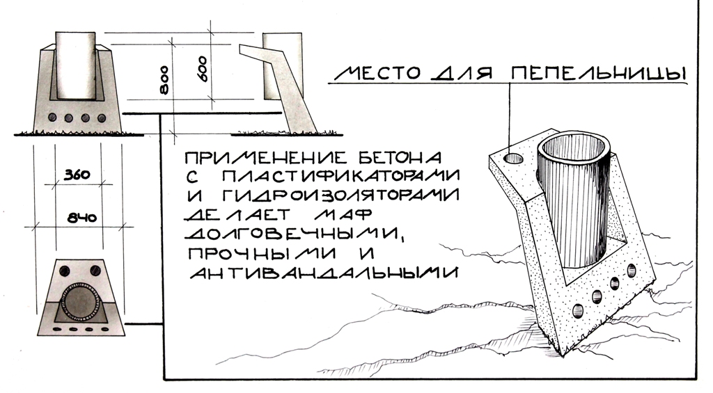 Применение в конструкции бетона с пластифицирующими и гидроизолирующими добавками делают урны долговечными, прочными и антивандальными.
