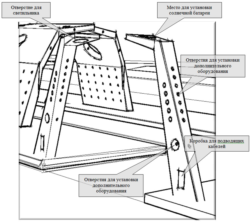 При изготовлении несущего остова светильника предусматривается максимальное количество отверстий для прокладки необходимых кабелей и возможности крепления всевозможного оборудования.
