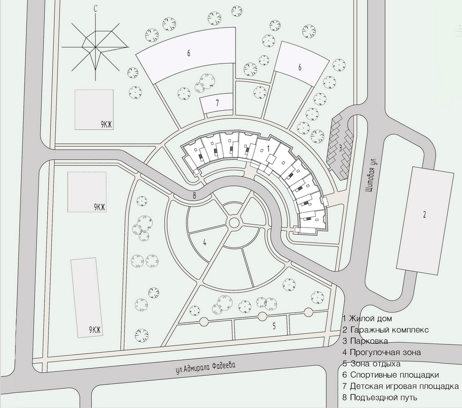 Местом строительства является территория на пересечении улицы Щитовой и улицы Адмирала Фадеева. Участок располагается в районе нового усиленного строительства жилых домов, это 9-ти, 16-тиэтажные дома, преимущественно белого цвета с цветными архитектурными деталями. Проектируемый жилой дом станет доминантой в этом районе города. На востоке от здания на расстоянии 400 м находится Стрелецкая бухта Черного моря, на западе в 100 метрах – парк Победы. На юге располагаются жилые кварталы. В данный момент на выбранной территории расположены ряды металлических гаражей, с восточной части – гаражный кооператив, что является несколько неоправданным градостроительным решением, учитывая огромную площадь гаражей и близость моря и парка. Поэтому решено было разместить здесь жилой дом, а площадь под гаражами использовать более рационально: построить в этом месте гаражный комплекс из 3 этажей, сократив территорию гаражного кооператива в 4 раза, а прилегающую территорию использовать для отдыха и прогулок жителей проектируемого дома и окрестных кварталов. Выбор места строительства не случаен: парк Победы расположен в непосредственной близости от центра города, что поможет жителям дома быстро добираться до работы (учебы), свежий воздух и близость моря делают место удобным для комфортной жизни.