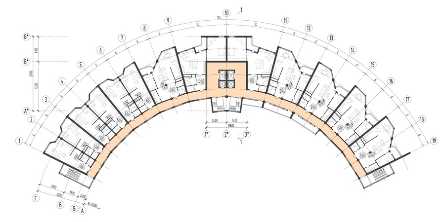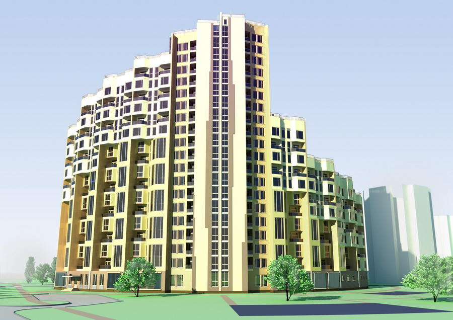 В многоэтажном жилом доме предусмотрено удобное размещение жилых комнат и вспомогательных помещений.
