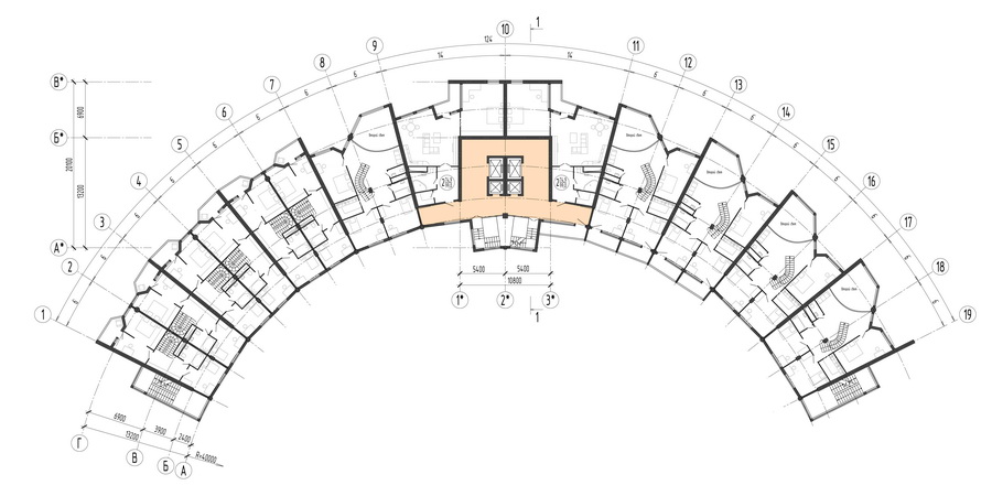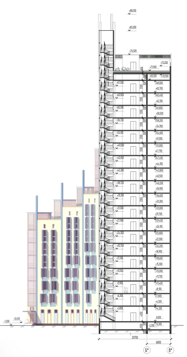 Объём жилого дома представляет собой ступенчатое образование сложной формы. В плане здание имеет форму сегмента окружности. Крыши проектируемого жилого дома венчаются колоннами, которые имеют конструкционное назначение и выполняют декорирующую функцию на фасаде. Объем главной лестницы вынесен за пределы здания и является центром композиции. Вспомогательные лестницы так же вынесены за объем здания и ведут с каждого конца галереи на крышу и на 1 этаж.