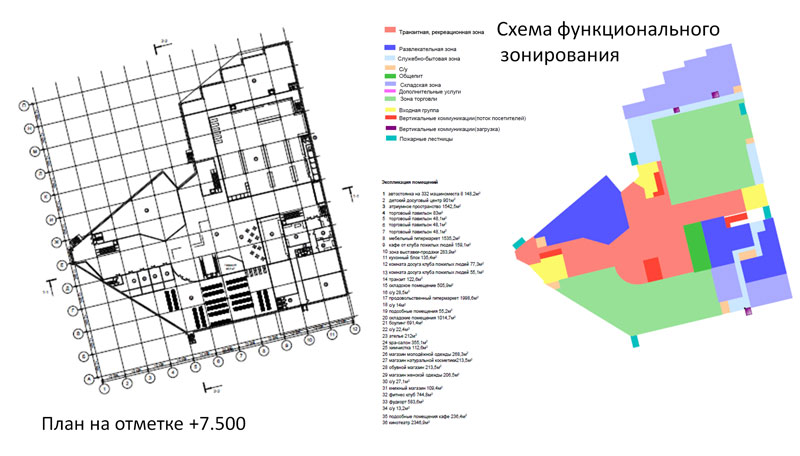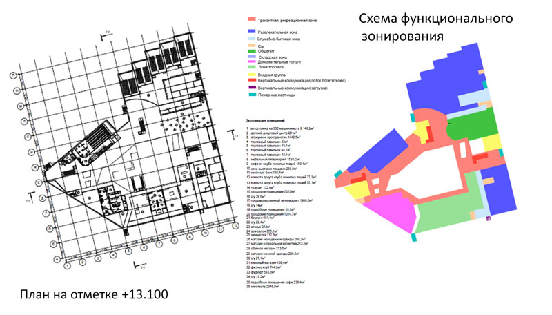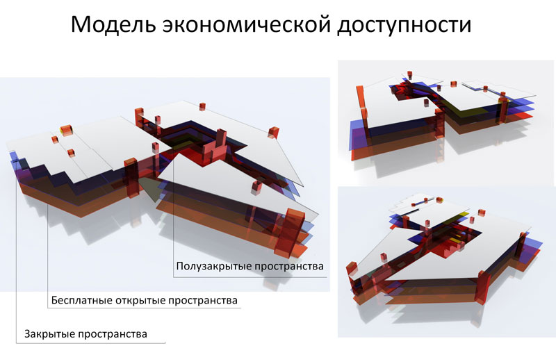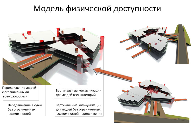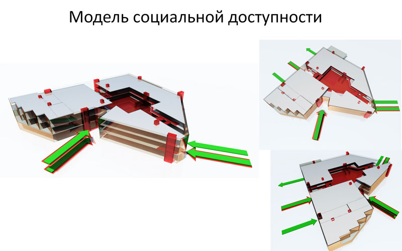 Это нашло отражение в формировании безбарьерной среды, возможности свободного доступа для разных социальных классов, а также в наличии пространств, дифференцируемых по экономическим признакам. Исходя из сложившейся градостроительной ситуации в ТРЦ сформировалось три основных входных группы (помимо дополнительных с уровня парковки) .