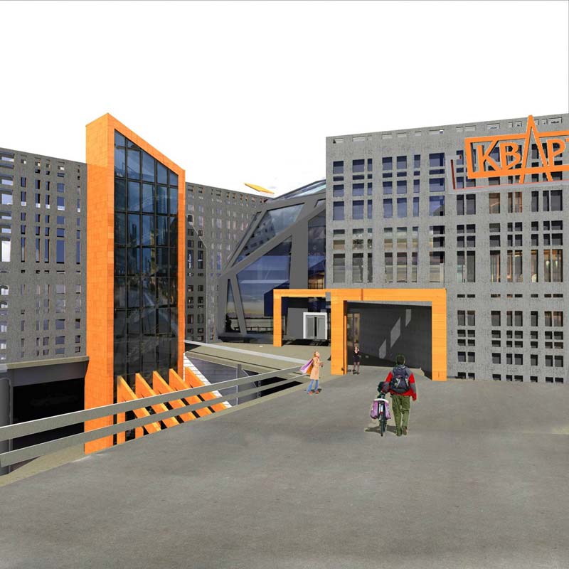 Потоки посетителей , попадая с разных, удобных им входов, смешиваются в общем атриумном пространстве. Это площадь ассоциативная площади общеквартальной (городской): пространство общедоступное для всех категорий посетителей. На основе этой идеи сложилось название ТРЦ «Квартал».