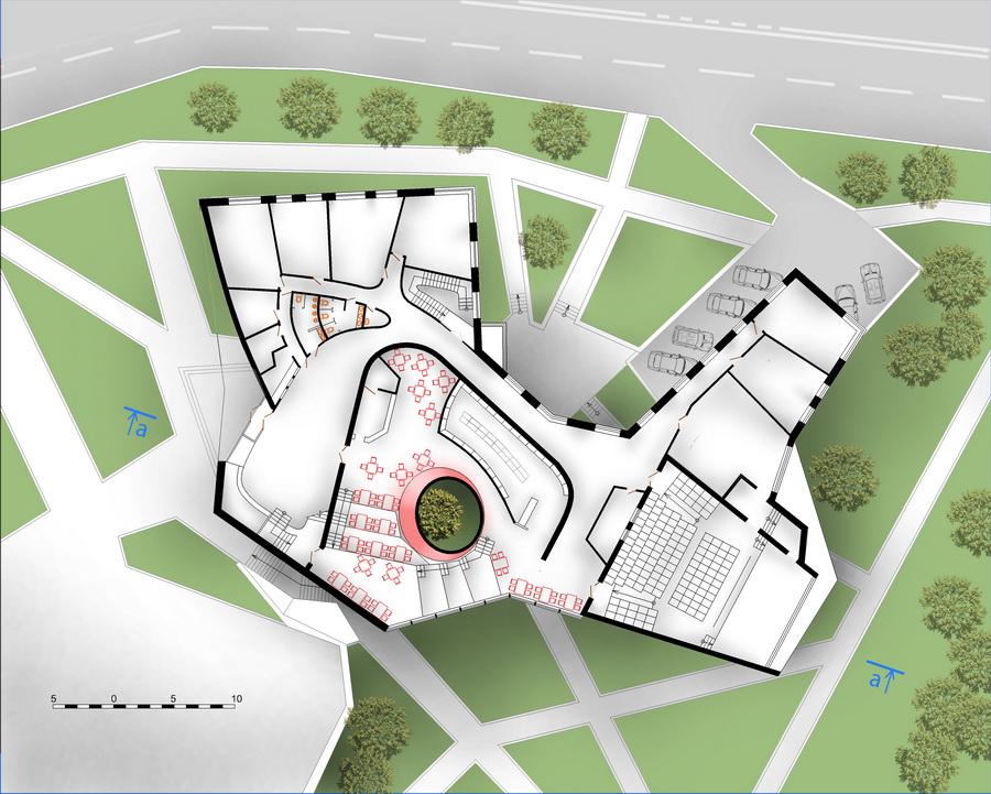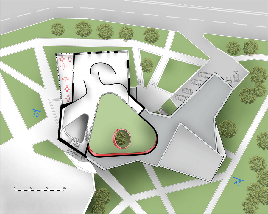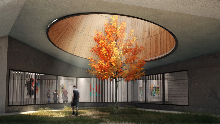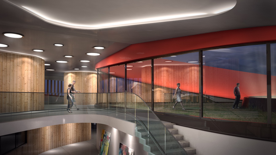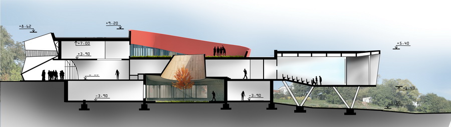 При этом он не выглядит тяжёлым за счёт остекления и интегрированного нижнего внутреннего двора, создающую уютную атмосферу. Верхняя терраса как закрытый двор создающий уединение и защищённость. Ориентация наклонного контура и всего здания на запад открывает живописные вечерние виды.