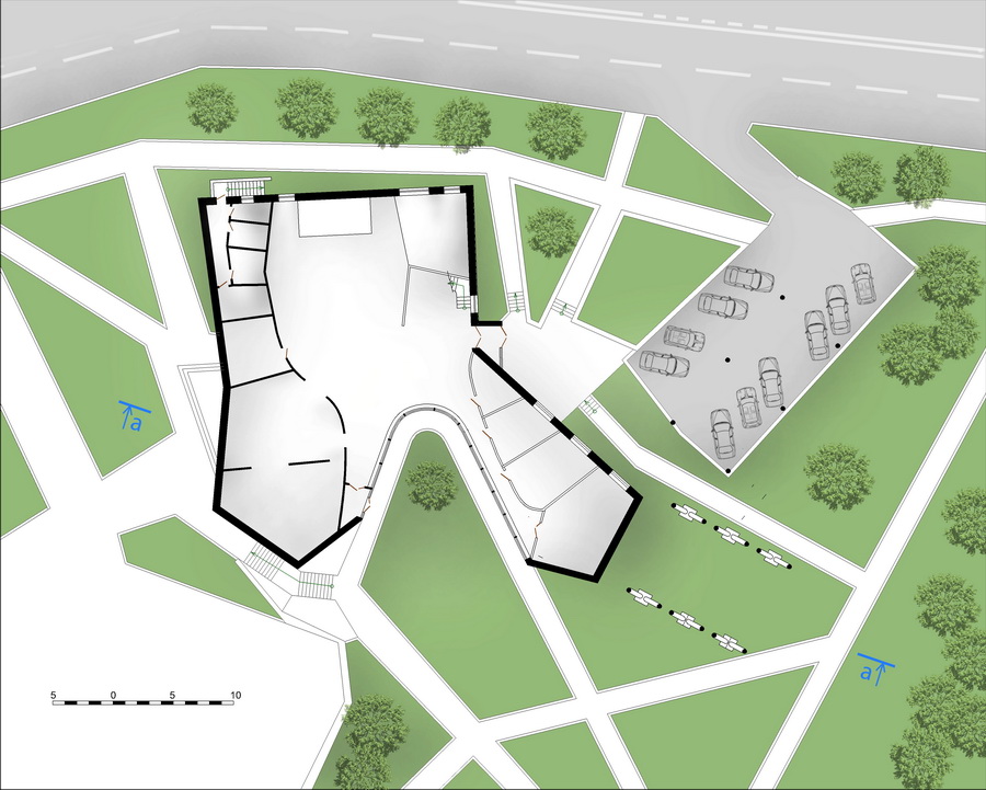 Клуб находится на склоне, ориентированном на запад. Под ним раскрывается долина с парком и жилой застройкой из блокированных и частных жилых домов. Это определяет архитектурные решения – ориентация здания, нависания части клуба над долиной, парком – что создаёт более сильный образ, несмотря на небольшие габариты и малую этажность.