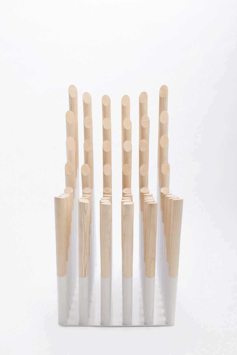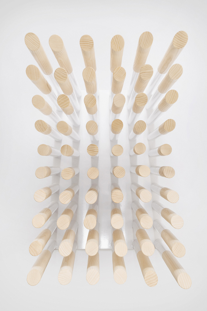 Вес сидящего распределяется на более чем 60 деревянных стержней, которые установлены в основание, изготовленное из стали. Стержни имеют разную длину, подобранную так, чтобы сидение на стуле не доставляло дискомфорта.