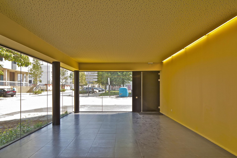 Один из углов дома на первом этаже был полностью застеклён. В этом месте находится основной вход в здание. Преодолев этот стеклянный барьер, видишь желтые стены, вносящие дополнительное цветовое разнообразие в чёрную внешность здания. За домом находится парковка с зелёными парковочными местами.