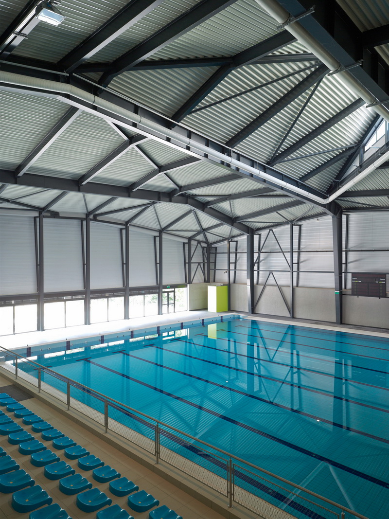 Здание спортивного комплекса состоит из двух квадратных корпусов одинаковой площади. В одной из частей располагается бассейн и некоторые технические помещения, а в другой – спортивный зал с трибунами для зрителей.