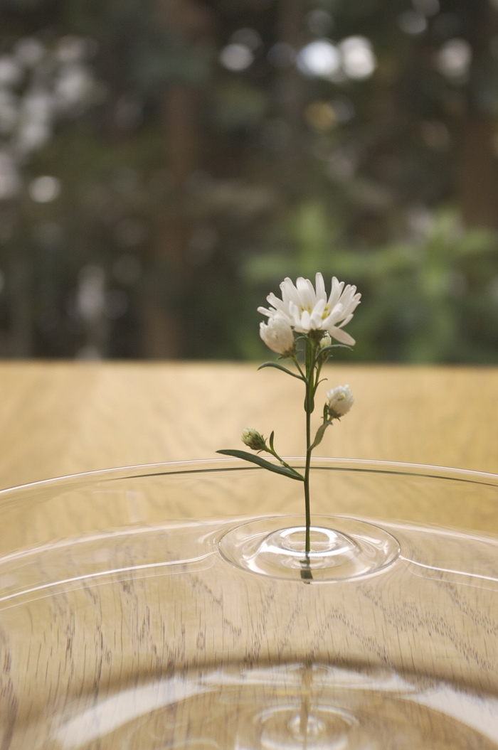 При первом взгляде на данное дизайнерское решение кажется, что на воде образовался круг, в котором чудесным образом держится цветок. А где же ваза? А круг и есть эта самая ваза.