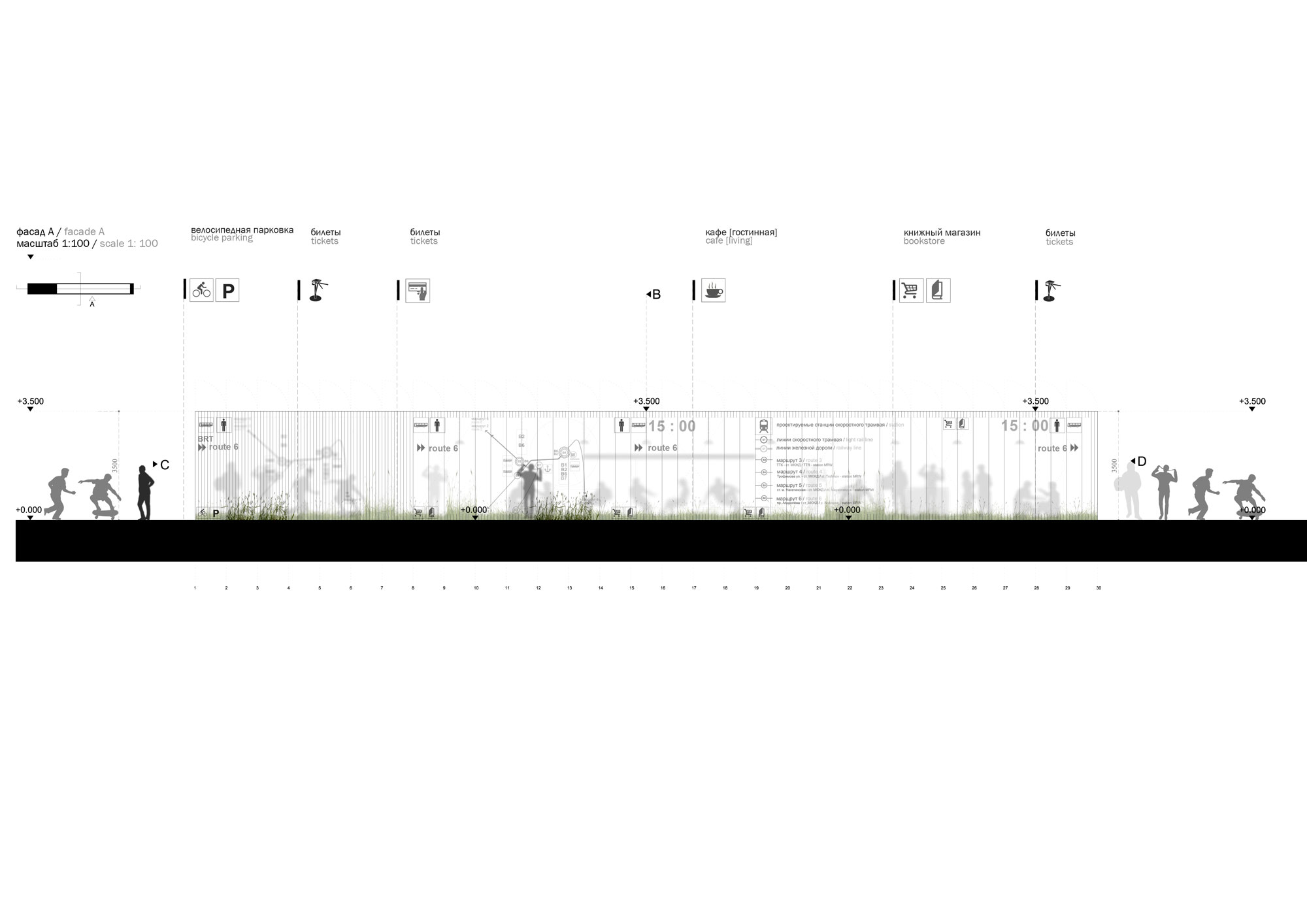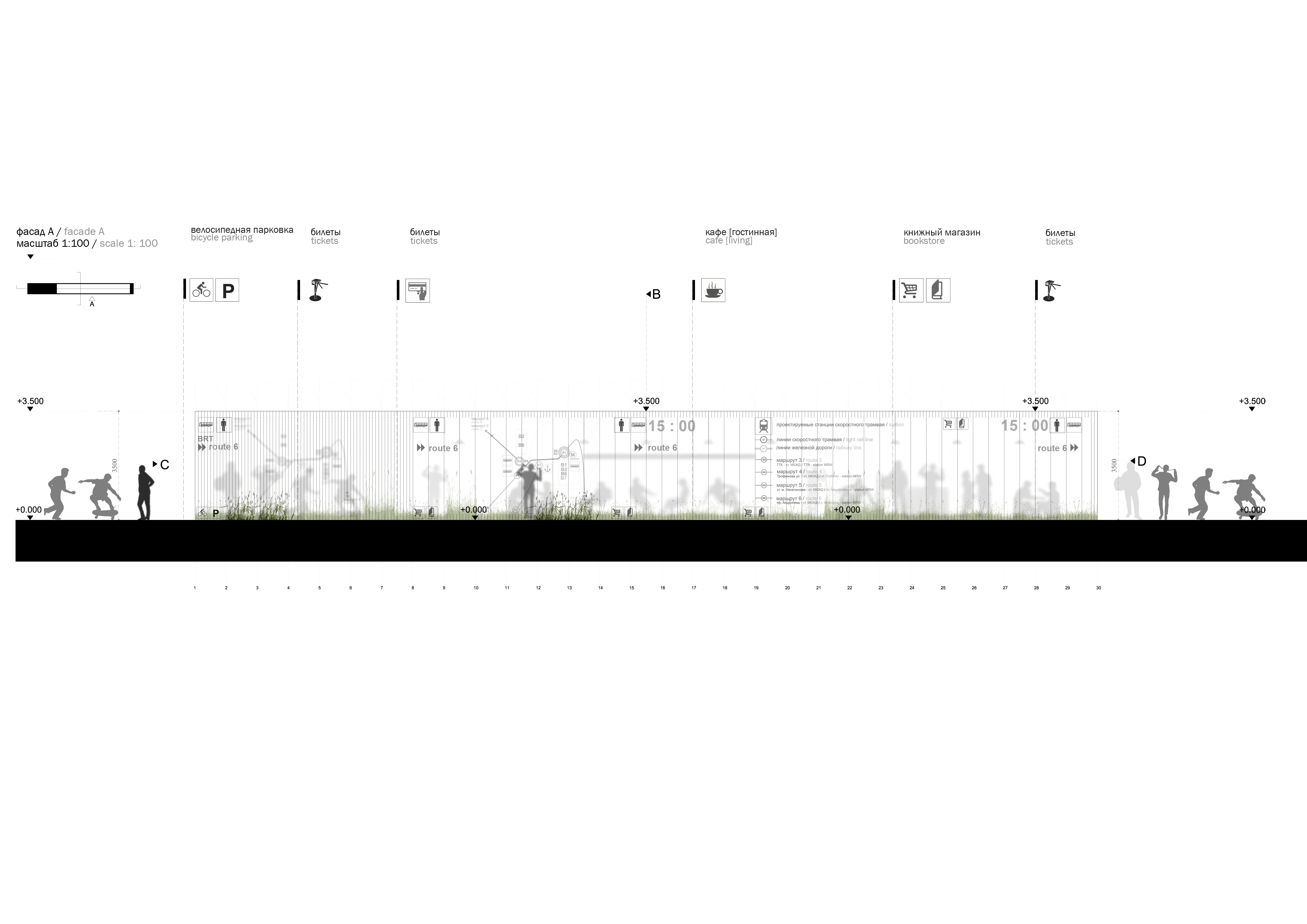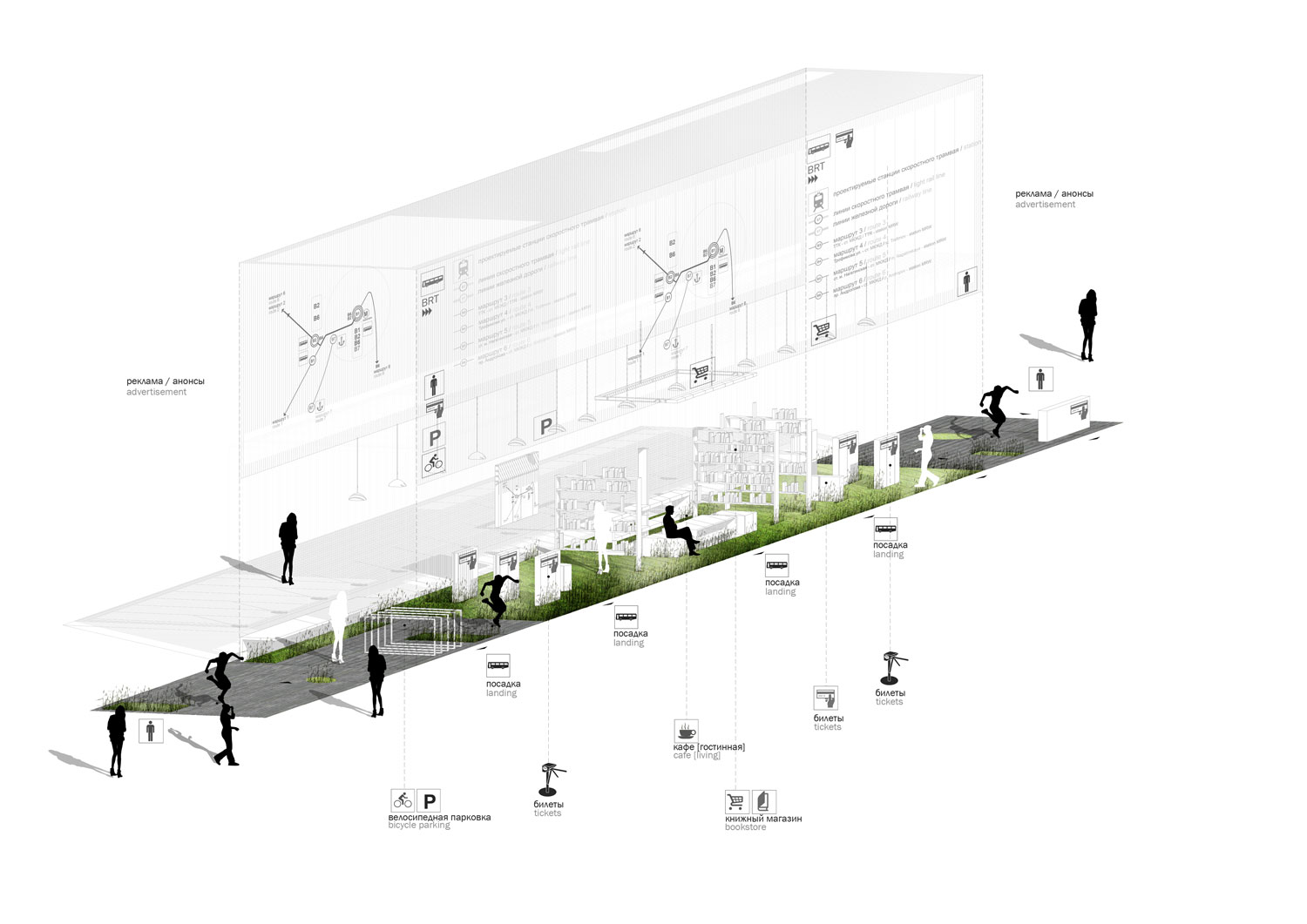 Объект разделяется на стационарную пространственную конструкцию, выполненную из легких металлических конструкций с шагом 1 м, и наполнение, варьирующееся в зависимости от потребностей жителей и особенностей локального городского контекста.