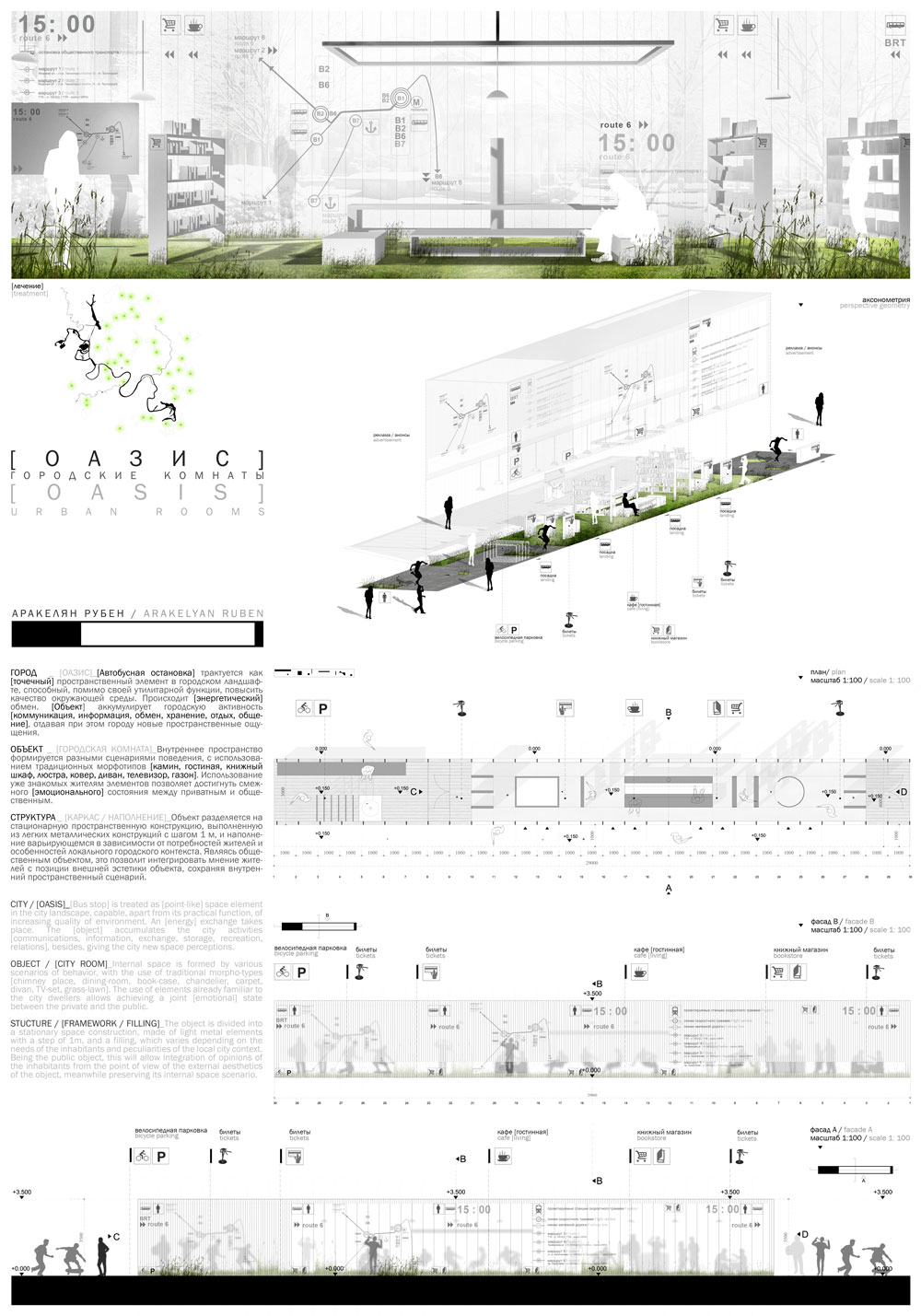 Автобусная остановка трактуется как точечный пространственный элемент в городском ландшафте, способный, помимо своей утилитарной функции, повысить качество окружающей среды.