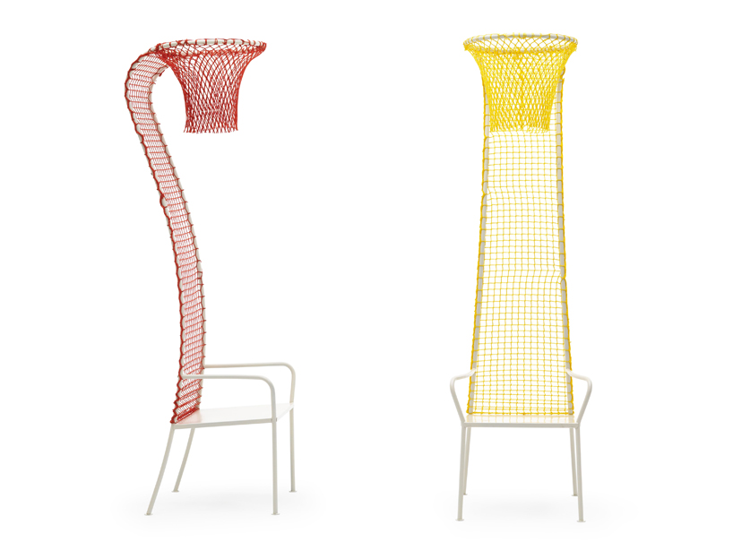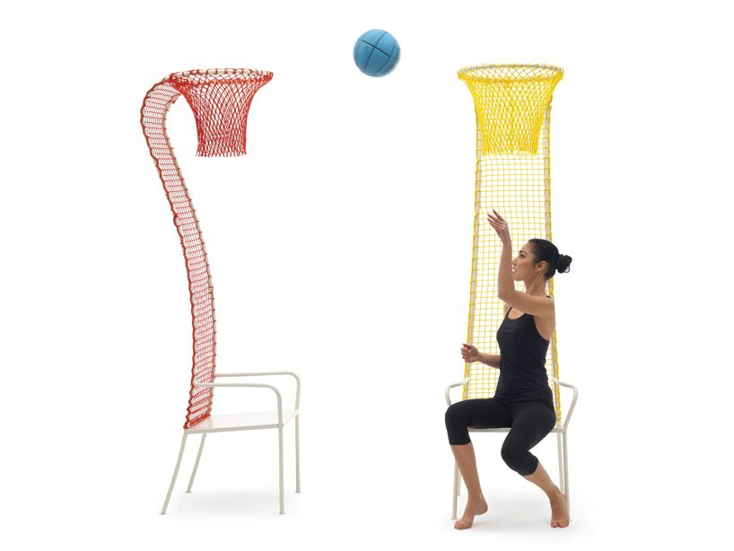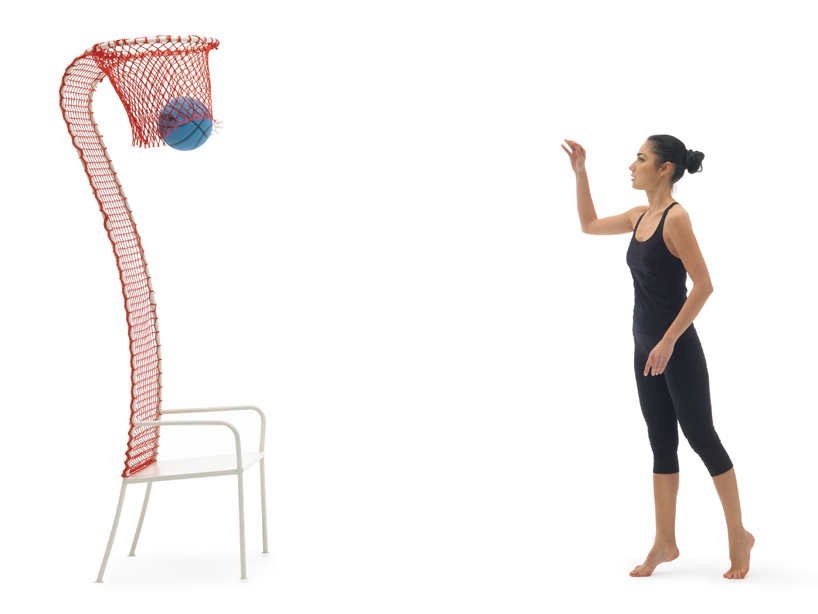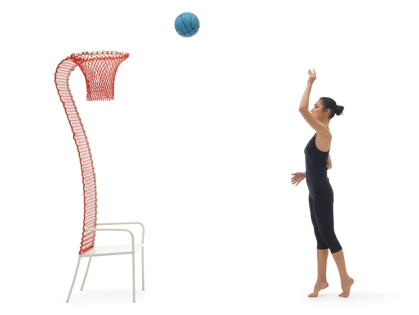 Хочется покидать мяч в кольцо, но так лень выходить на баскетбольную площадку? Этот стул решит все ваши проблемы. Простая металлическая конструкция имеет очень длинную спинку, которая заканчивается баскетбольным кольцом. На кольце весит цветная сетка, с помощью которой также сформирована плоскость спинки стула.