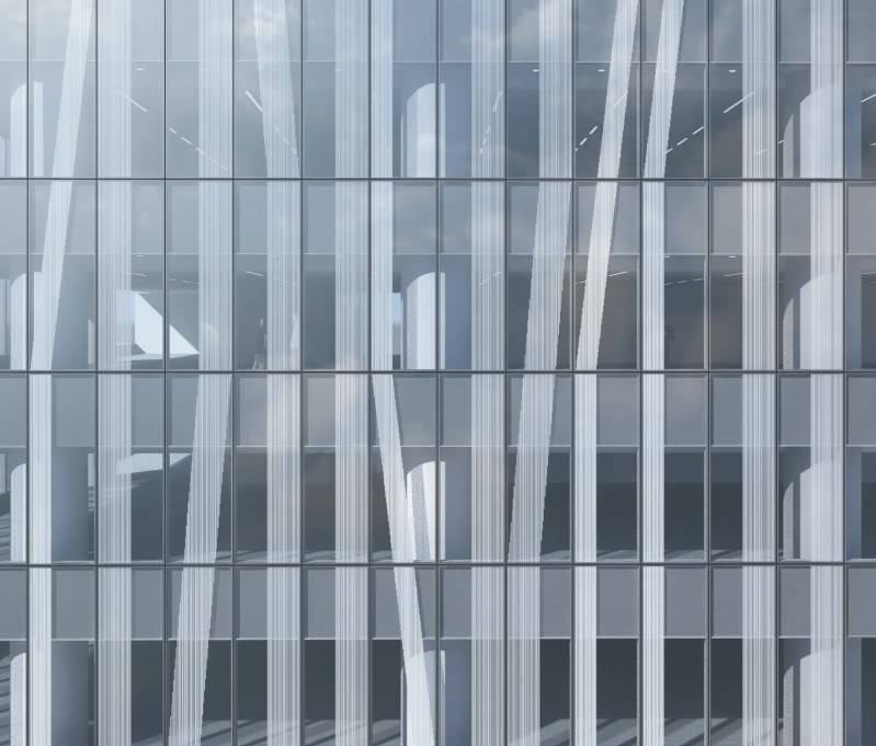 Под стеклянной «одеждой» здания виден рисунок с местными природными мотивами. Этот узор напоминает стволы бамбуков или струи стекающей воды.