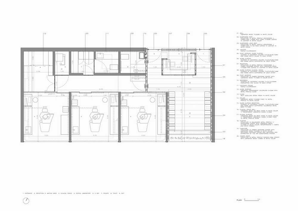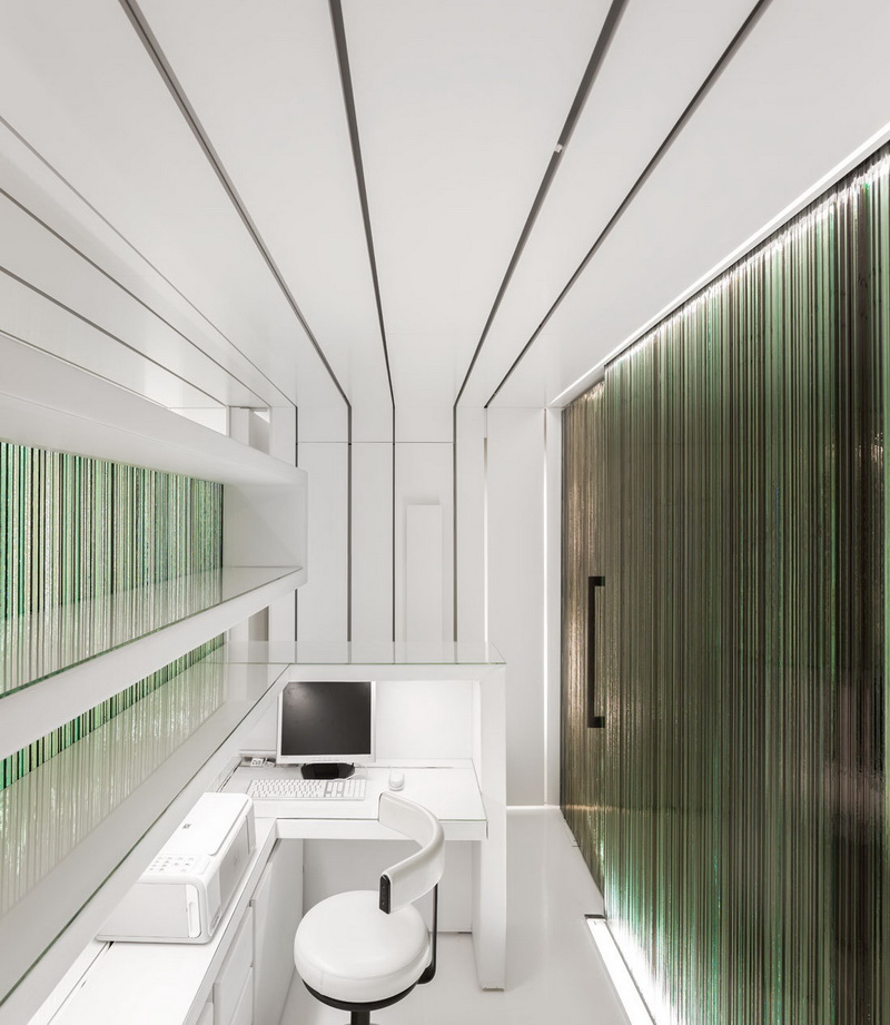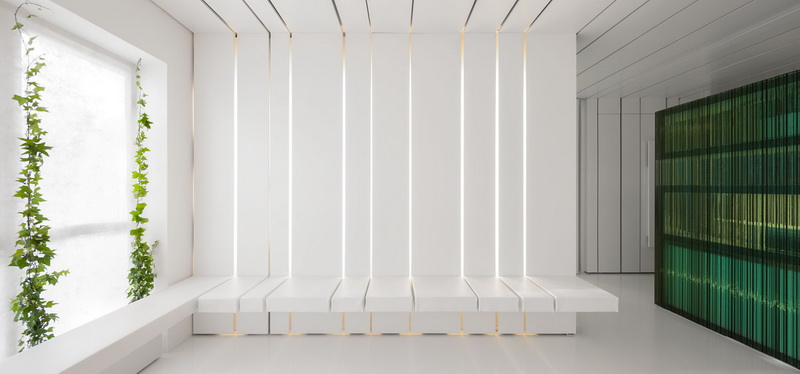 Стены и потолок комнаты ожидания и зоны регистрации пациентов украшены вертикальными полосами, которые помогают сформировать характер клиники.