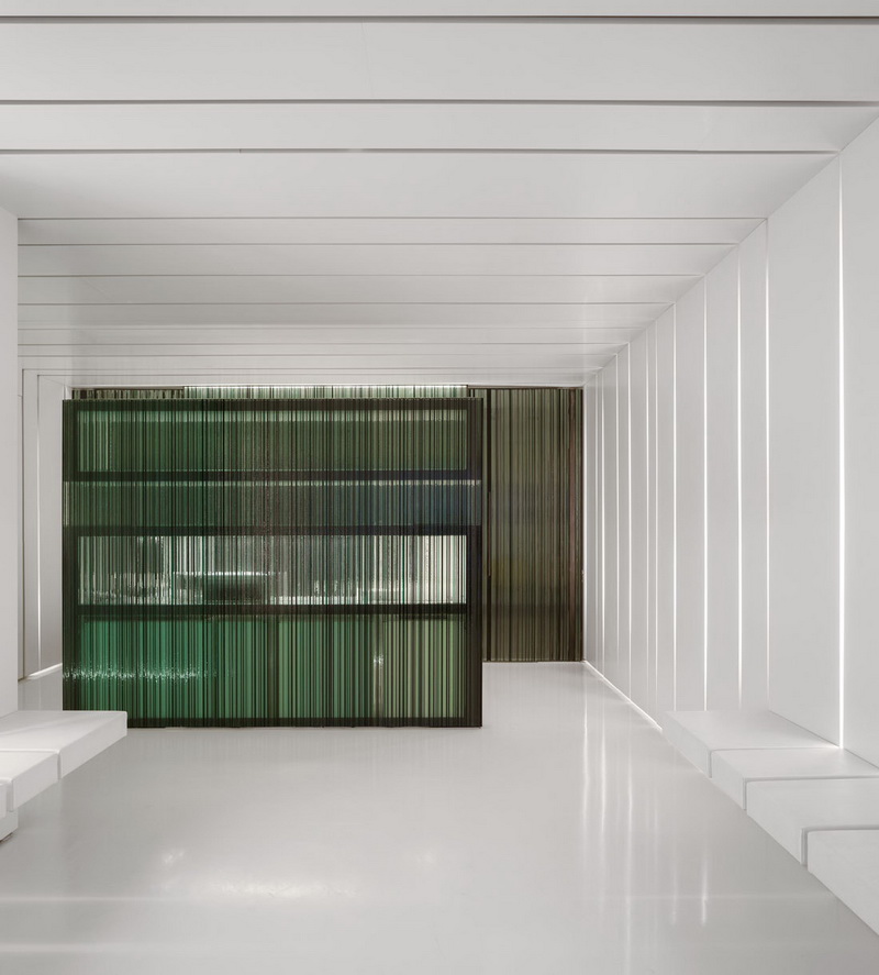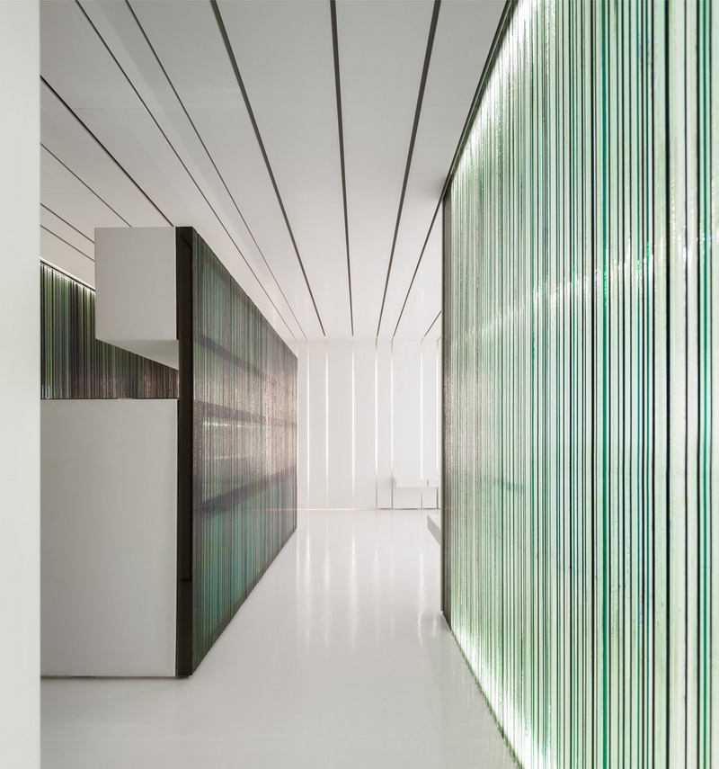 Стоматологическая клиника отделена от внешнего мира зеленоватой полосатой стеклянной стеной.