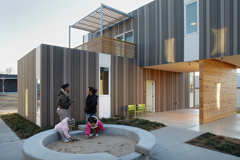 Некоторое время назад жилищное управление города Топика, штат Канзас, США, получило национальный грант, направленный на стимулирование развития инновационного и экологически рационального строительства в секторе малобюджетного жилья. В рамках этого гранта архитекторам из местной компании необходимо было предложить новый взгляд на дома-дуплексы, учитывать ограниченный бюджет и придерживаться «зелёных стандартов».