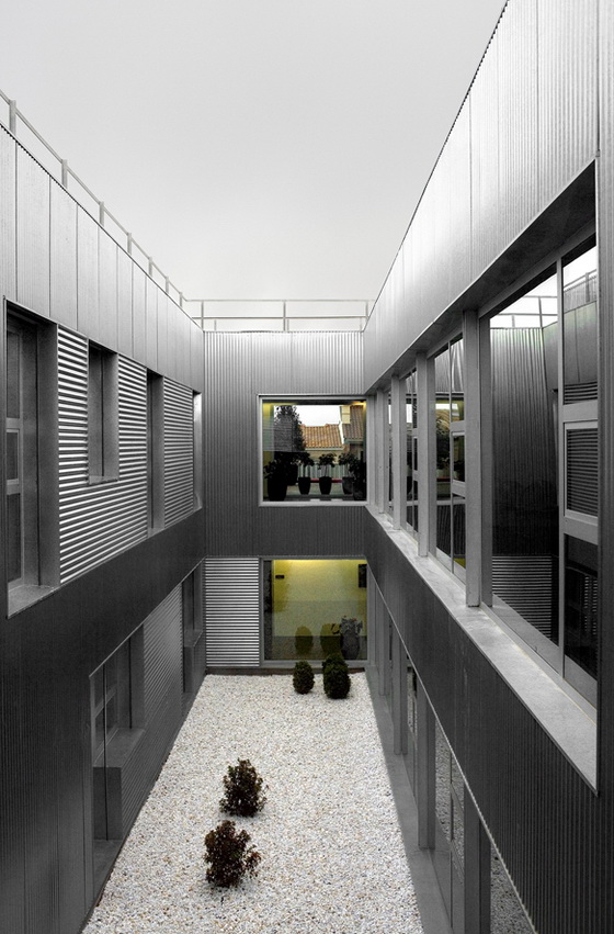 Внешней кожей здания, за которой скрываются стены красноватого цвета и окна, стала решетка, собранная из перфорированных оцинкованных пластин.