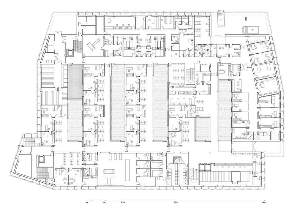 Внутри здания расположены пять прямоугольных внутренних двориков, вдоль которых идут параллельные коридоры, по одной стороне каждого из которых находятся кабинеты.