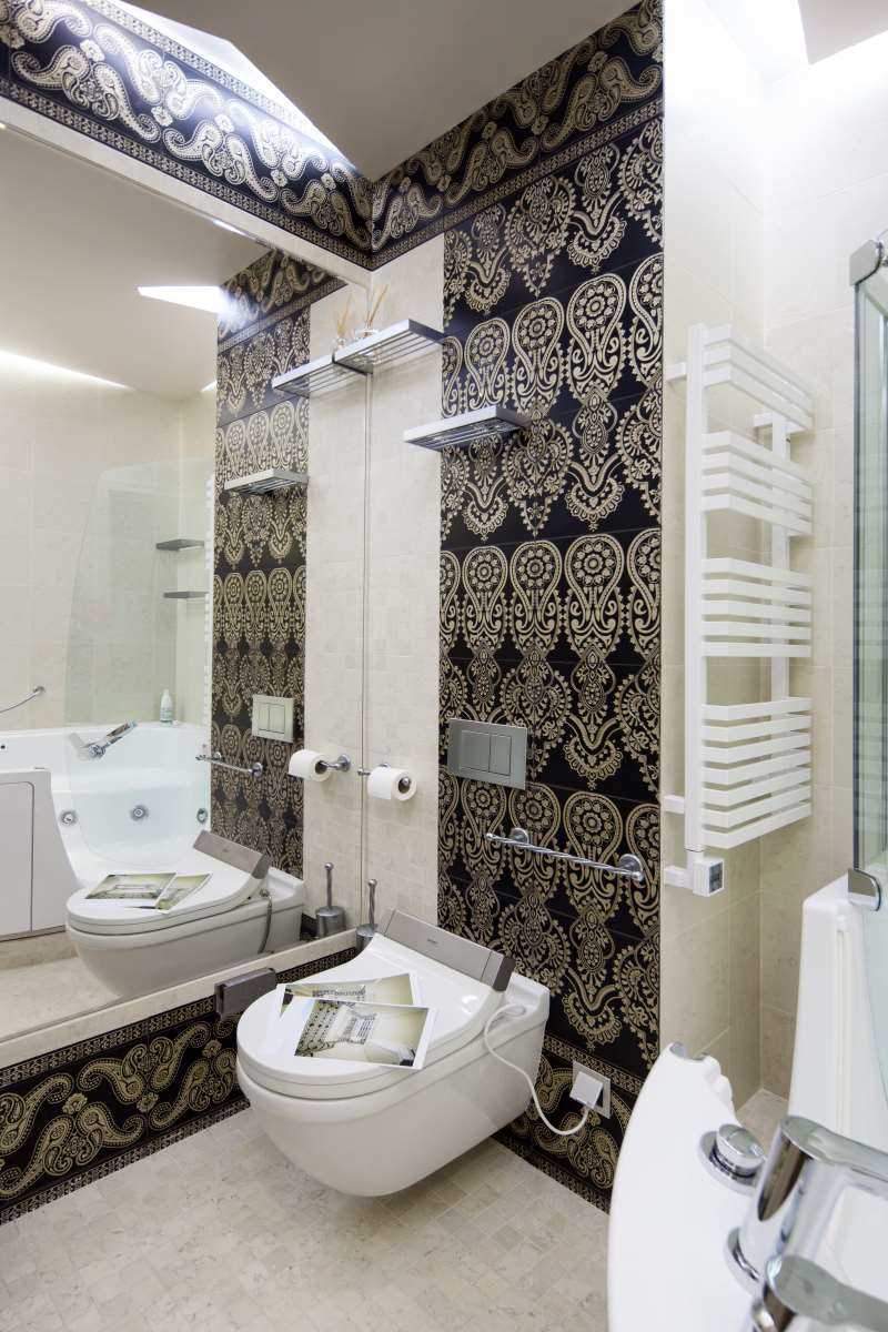 4. Декоративная стена из черной плитки является обрамлением зеркала. Узор и размер плитки сделан с учетом габаритов стен, чтобы рисунок смотрелся целостным и аккуратным;