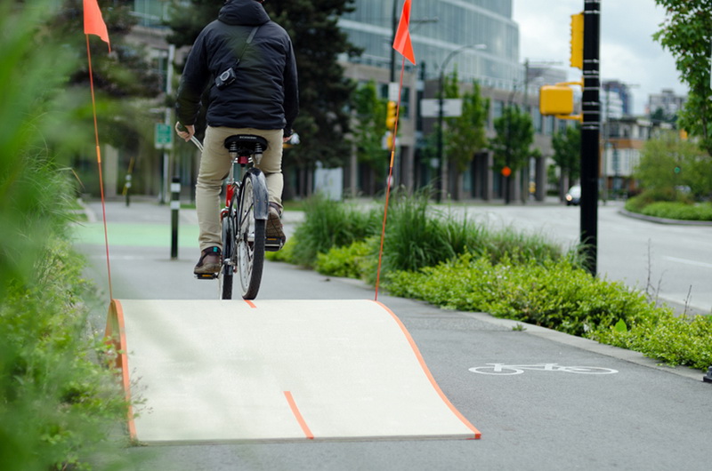 На существующую велодорожку в разных местах были установлены небольшие велорампы. Благодаря им в обычную поездку вносится игровой элемент.