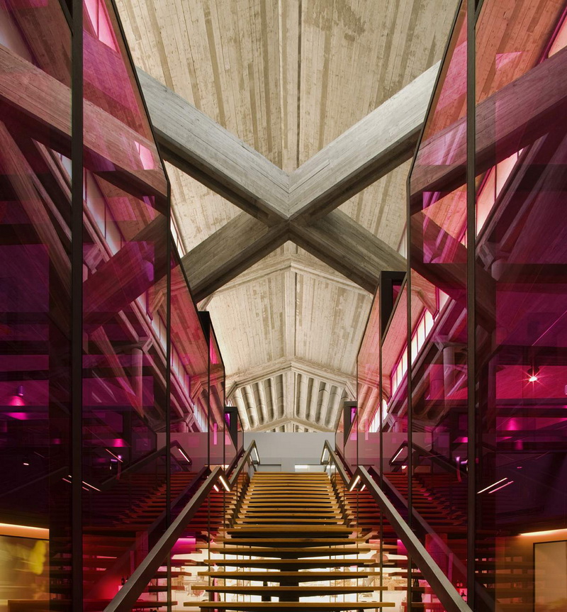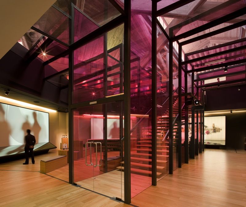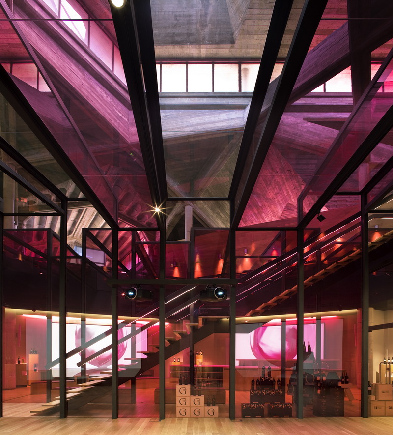 Различные зоны нижнего этажа разделены перегородками из стекла розового цвета, который напоминает о насыщенном цвете вина.