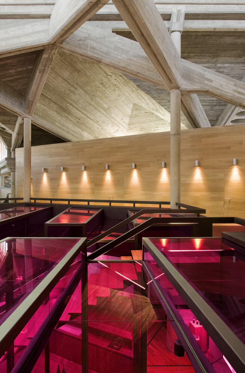 На нижнем этаже были предусмотрены современное выставочное пространство, магазин, где можно приобрести разнообразные сорта вин, и бар, где вино можно попробовать.