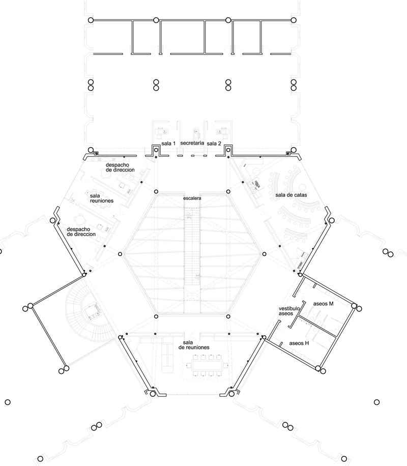 Часть здания, в которой располагается центр виноделия, имеет форму шестиугольника. Её можно смело назвать сердцем всего винодельческого комплекса. Площадь шестиугольной части составляет 1 066 квадратных метров.