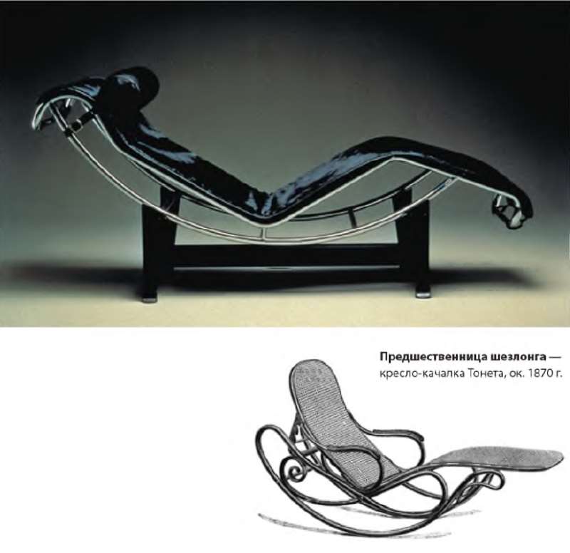 Ле Корбюзье — один из тех, в чьих творениях прослеживается внимание к деталям и пропорциям, как, например, в его шезлонге. Хромированная трубчатая рама шезлонга — дуга, опирающаяся на простые черные подпорки. Дуга представляет собой изящную и простую систему, которая выдвигается в любом направлении, позволяя пользователю выбирать из бесконечного разнообразия позиций, и фиксируется благодаря силе трения и гравитации так, что наверху оказываются либо ноги, либо голова. Как и дуга, подушка также имеет геометрическую форму цилиндра и легко перемещается. Конструкция шезлонга выполнена таким образом, что позволяет снять каркас с подпорок и использовать в качестве кресла-качалки.