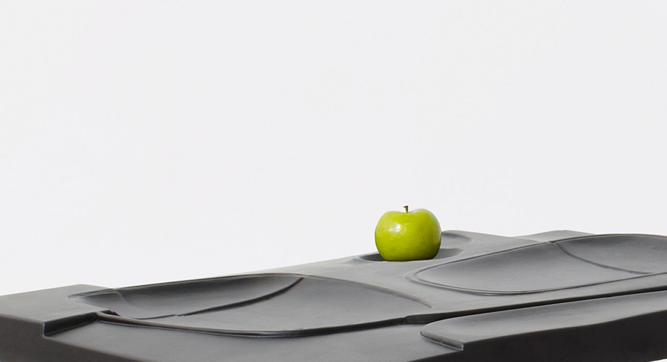 На столешнице-подносе имеется ряд углублений. Самое большое из них по площади формирует тарелку для основного блюда. В маленьком, но при этом глубоком отверстии может находиться соус или какой-нибудь фрукт.
