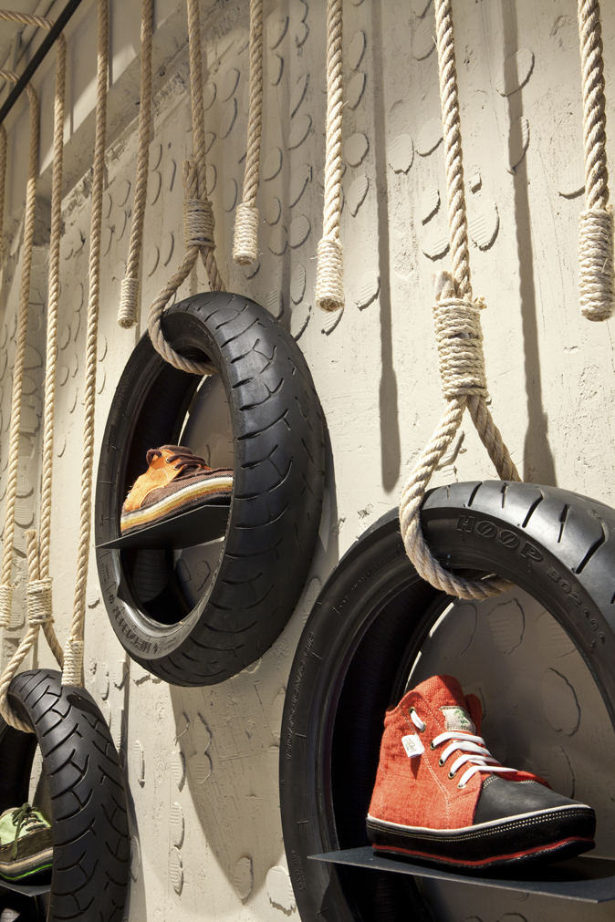 Под потолком и по обеим стенам спускаются верёвки. На некоторых из них закреплены автомобильные шины, ставшие обрамлением для обуви.
