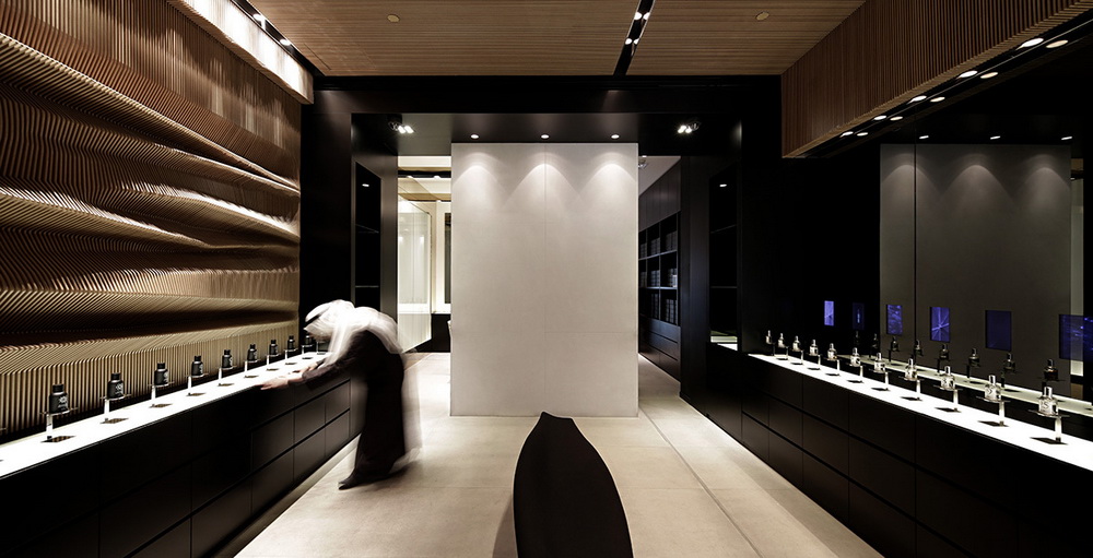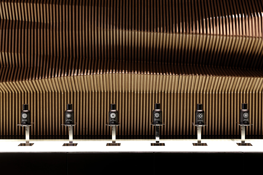 Пространство бутика разделено на 2 зоны. В одной из них представлена коллекция ароматов «TFK», а в другой зоне покупатели могут в более приватной атмосфере выбрать подходящие духи.
