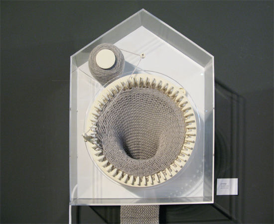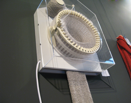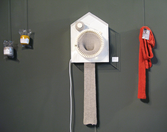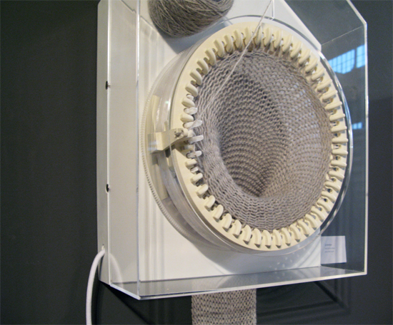 Внутри часов установлена кругловязальная машина с 48 спицами, катушка ниток и держатель для нити. Машина движется по часовой стрелке и за день вяжет один полный круг шарфа.