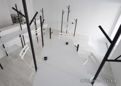 Чёрно-белое пространство совсем не выглядит скучным благодаря деревьям и ветвям, вырастающим из барной стойки и ножек столов.