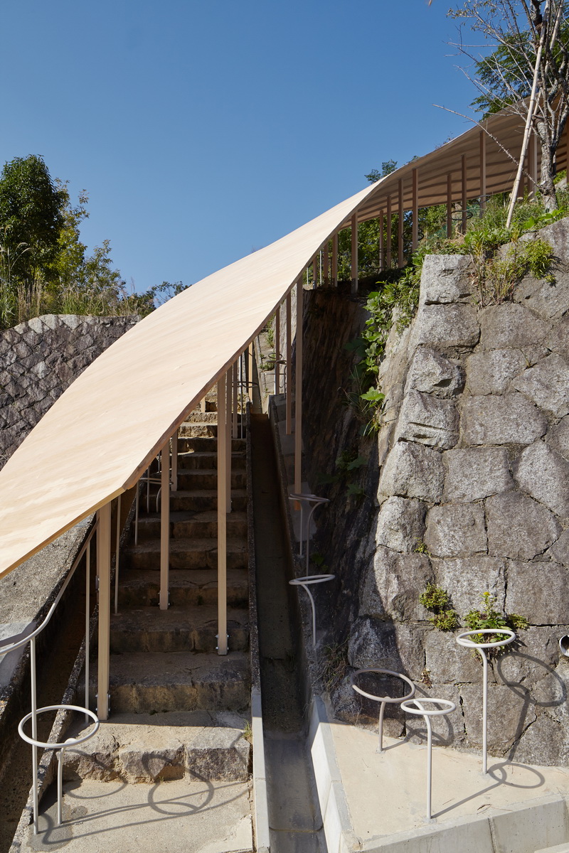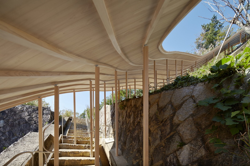 Лестницу, которая поднимается в гору, от дождя и палящего солнца укрывает плоская деревянная крыша, местами переходящая в стену.