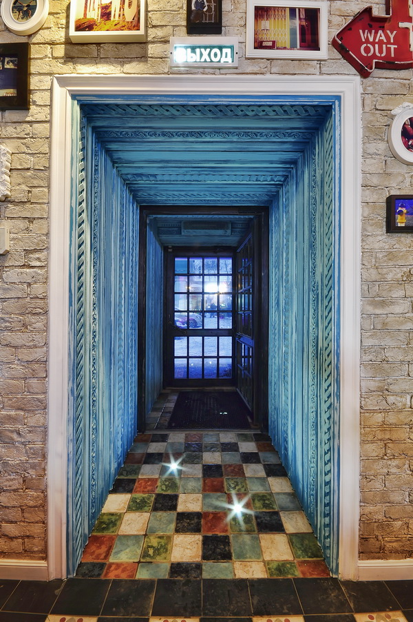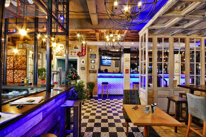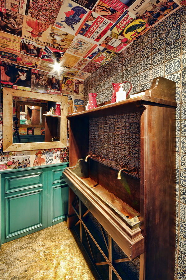 Мы старались в одной стилистке использовать как можно больше разнофактурных покрытий, различных текстур. В этом проекте у нас был использован керамогранит, плитка, дерево, имитация дерева. Нам интересны стыковки различных материалов и цветов: они создают особую нестандартную атмосферу. Часть пола из досок с принтами – это готовая новая керамогранитная плита от Peronda. Принты подобраны специально для интерьера, т.к. часть отделочных материалов мы использовали в соотношении дорого/супер дёшево. Барная стойка и часть потолка выполнена из простых досок, которые мы демонтировали с большого количества паллет. Если обратите внимание на полы в санузле – то они вообще из настоящих американских монет!