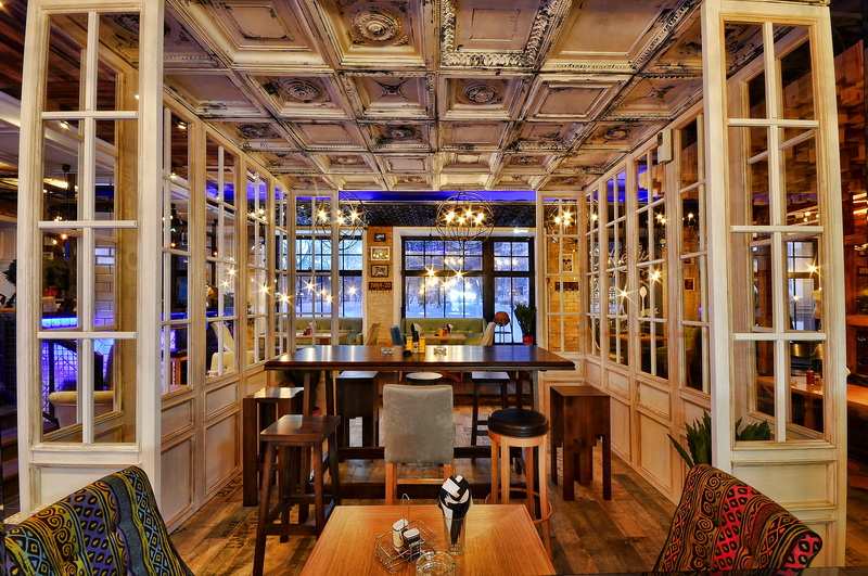 При проектировании перед нами была поставлена задача отделить каждую зону и в то же время удержать общую концепцию. Различные фальш-перегородки, подиумы, подчёркивание потолками отельных пространств, позволили превратить небольшое помещение в сложное многофункциональное заведение. По центру мы поставили коммунальный стол, который «загнали» в прозрачную веранду из дерева и стекла. Только этот момент уже сильно изменил общее внутренне восприятие интерьера. Также подиум мы отделили длинным двусторонним барным столиком со столешницами на разном уровне. Это позволило сэкономить на площади и увеличить количество посадки.