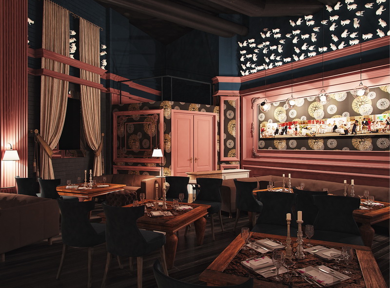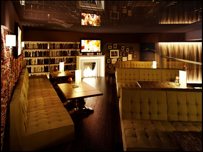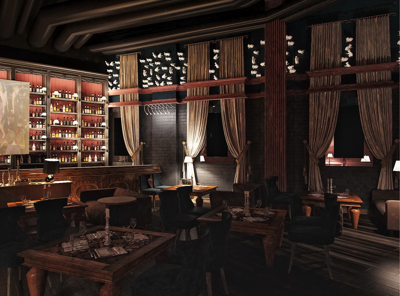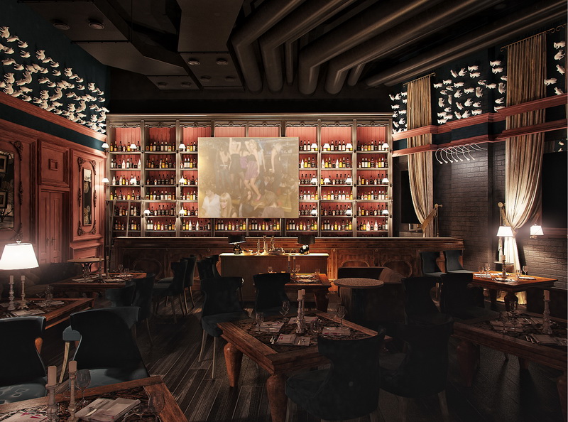 Экстрим-бар оформлен в стиле английской библиотеки. Архитектурный оксюморон (шум бара и тишина библиотека), ставший основой интерьера, напоминает, что периодическое сбрасывание груза социальных ролей – это профилактика душевных расстройств и проявление фундаментальной потребности личности в свободе.