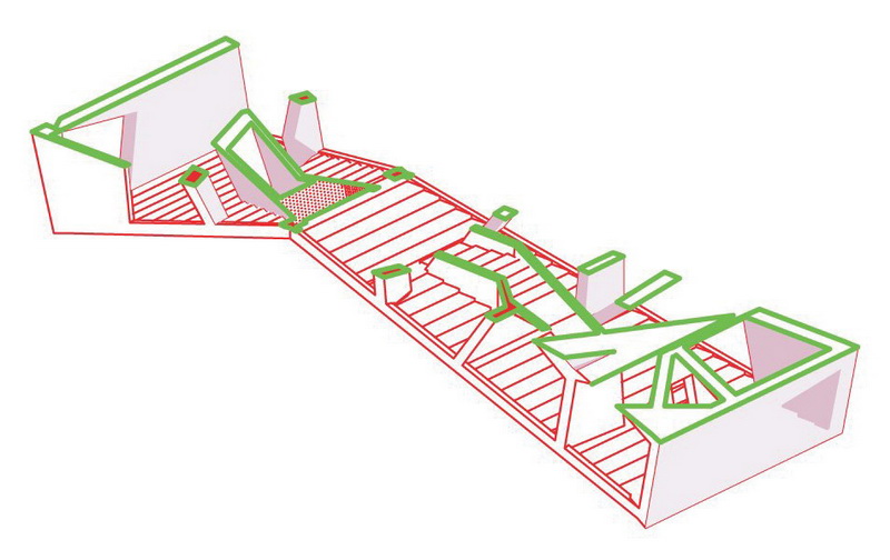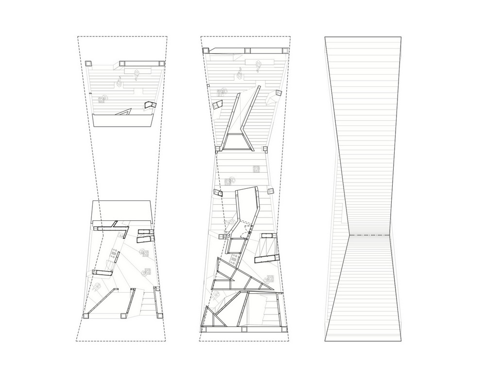 На разных уровнях внутри павильона расположены микроплатформы различных форм. Благодаря такому делению пространства человек может найти внутри строения для себя укромный уголок даже, если через павильон проходит большая группа людей.