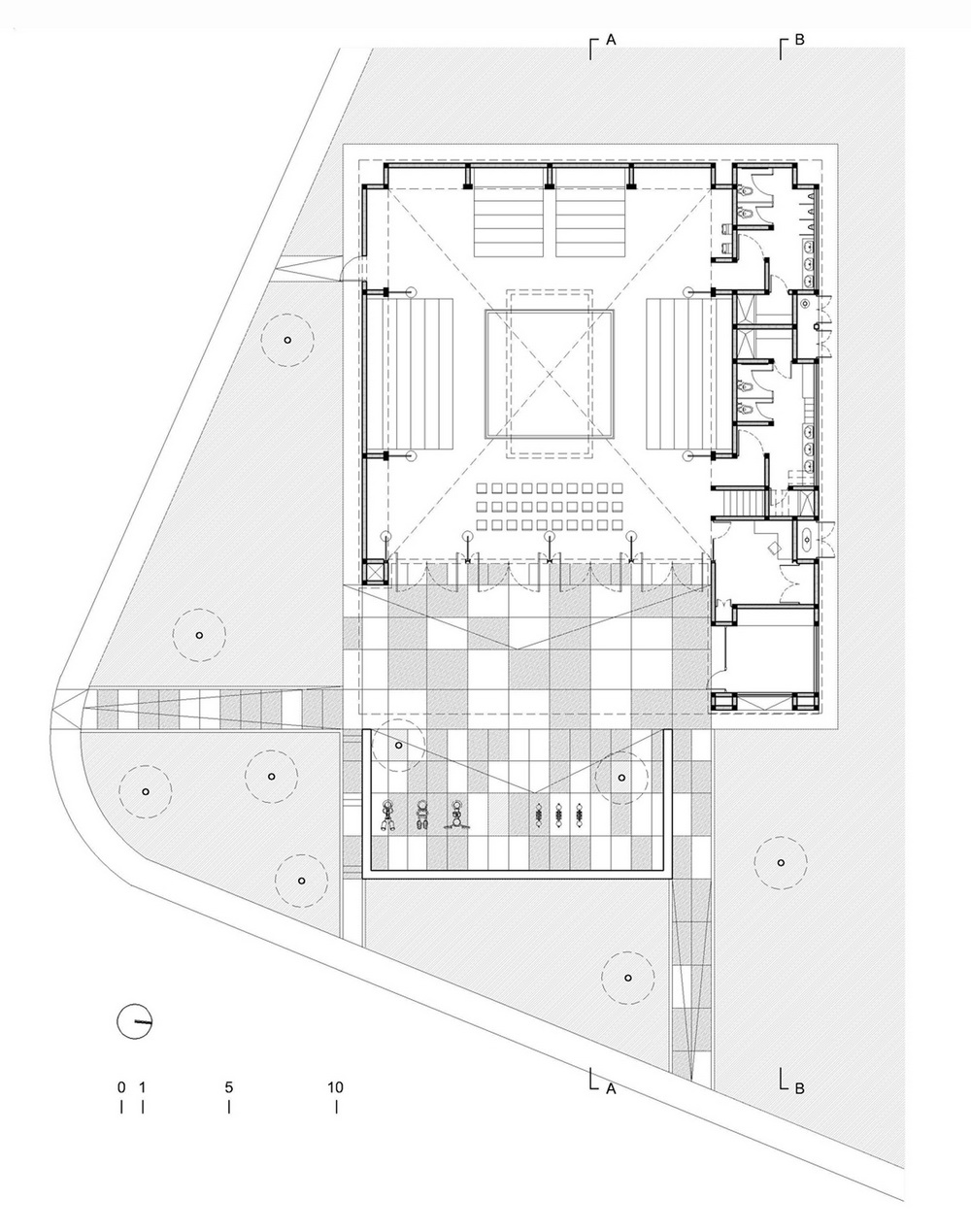 К зданию примыкает небольшая площадь, которая при открытых дверях становится продолжением зала. Местные жители могут использовать её для проведения каких-либо мероприятий.
