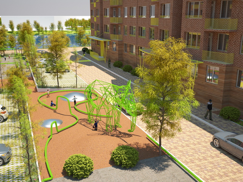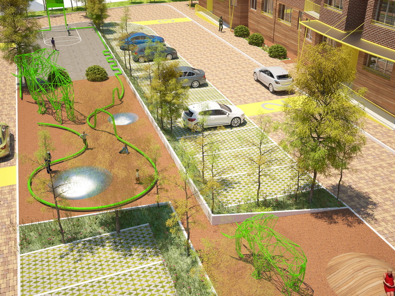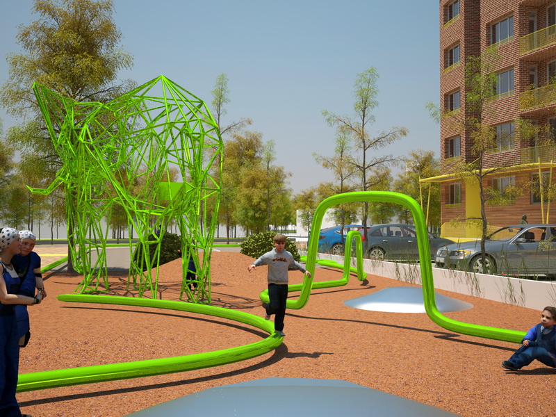 В основе идеи – линия зеленого цвета, цвета жизни, которая бы привлекала детей. Проходя через территорию жилого комплекса, она окутывает его, где-то поднимаясь, где-то опускаясь, создает интересные элементы для игр. Следуя за ней, ребенок попадает к разным частям игровой зоны.