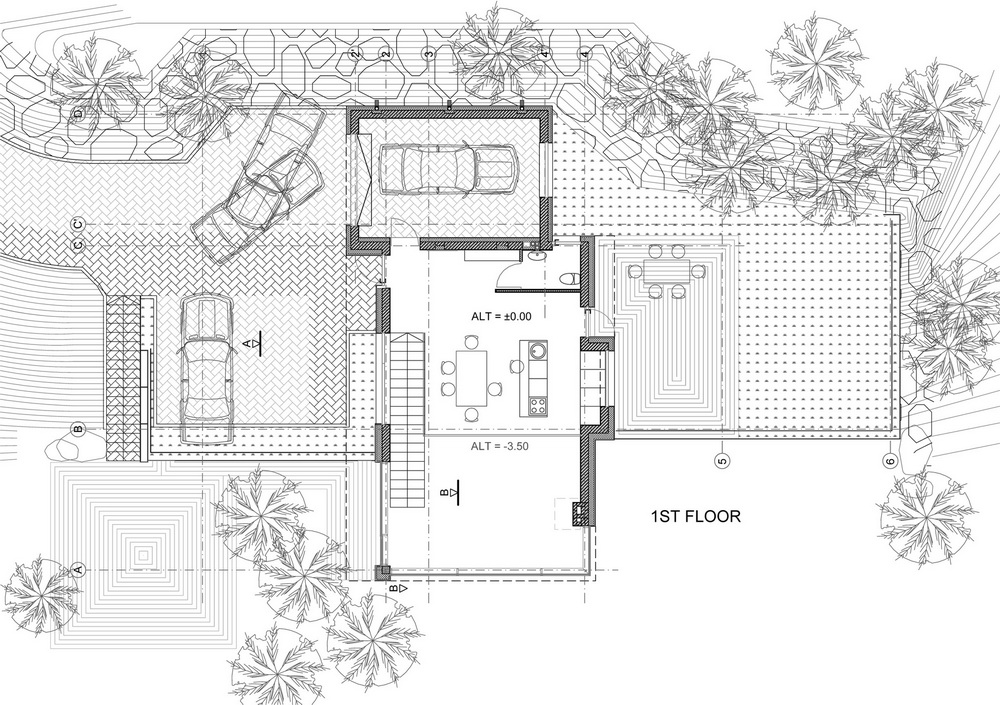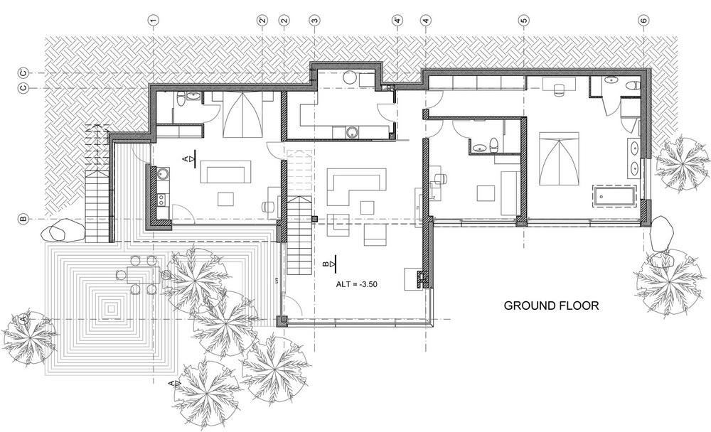 Значительная часть дома была «встроена» в существующий рельеф с заметным перепадом высот. Это позволила добиться хорошей теплоизоляции, что было особенно важно, учитывая большую площадь остекления здания.