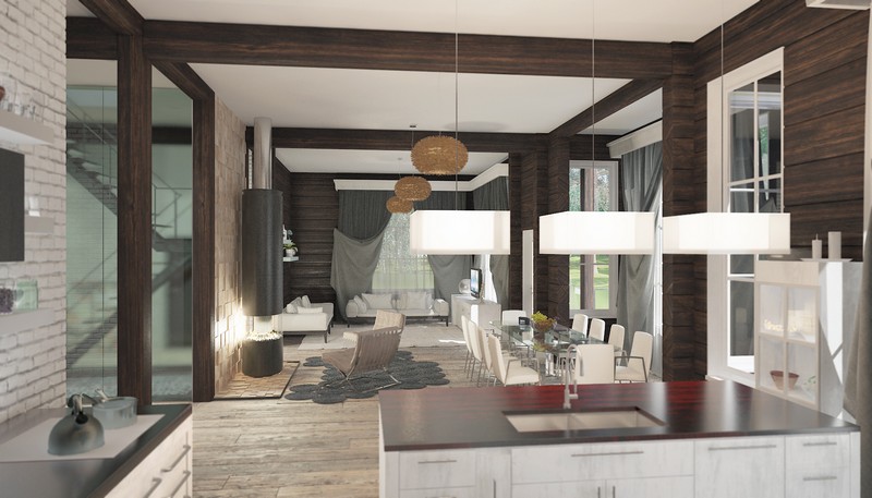 Моделью формирования интерьера был выбран минимализм. Дизайнеры решили не разграничивать стенами общее пространство, чтобы дать людям, находящимся в разных функциональных зонах, возможность беспрепятственно общаться друг с другом.