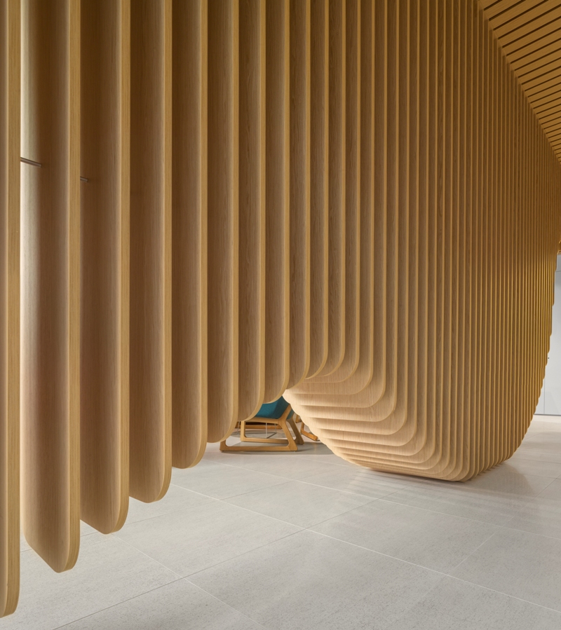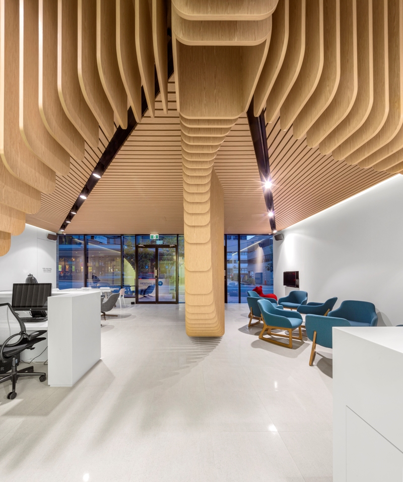 Архитектурное бюро Pedra Silva Architects разработало проект стоматологического центра в Сиднее, Австралия. Это клиника высшего уровня на одной из самых популярных австралийских улиц. Условия заказчика — наличие в проекте двух приемных зон и двух отдельных входов. Архитекторам удалось добиться этого с помощью волшебства — замены массивной колонны посредине холла на необычный деревянный элемент, который также служит разделителем двух зон.